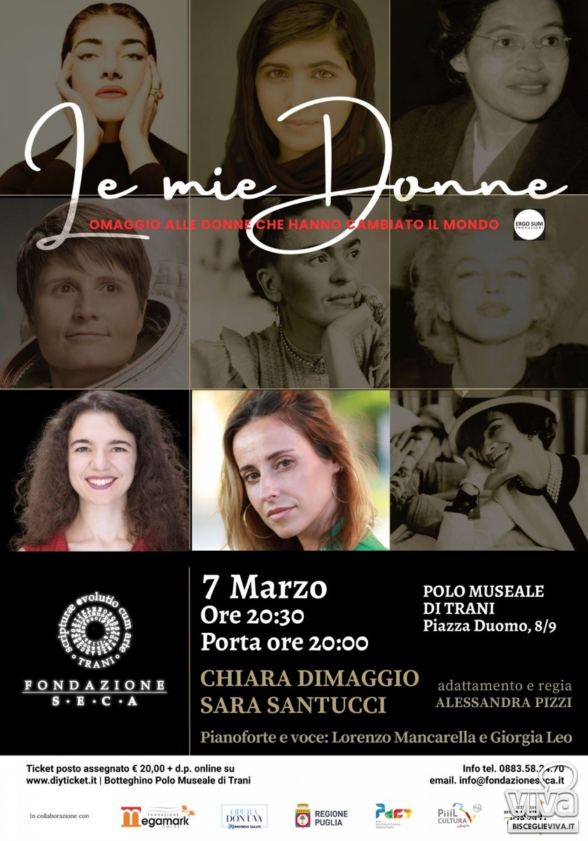 Al Polo Museale di Trani, per la Rassegna Teatrale 2026, il 7 Marzo andrà in scena lo spettacolo "Le Mie Donne. Omaggio alle donne che hanno cambiato il mondo", con Sara Santucci e Chiara Dimaggio e la partecipazione di Lorenzo Mancarella e Giorgia Leo, pianoforte e voce.
