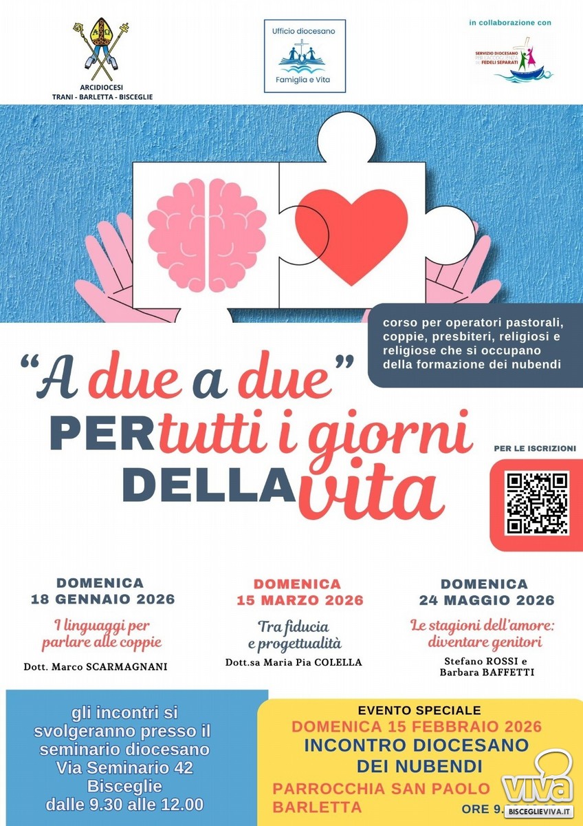 Un cammino formativo pensato per sostenere e qualificare l'accompagnamento delle coppie che si preparano al matrimonio è al centro dell'iniziativa promossa dall'Arcidiocesi di Trani-Barletta-Bisceglie, attraverso l'Ufficio diocesano Famiglia e Vita, in collaborazione con il Servizio diocesano per l'accoglienza dei fedeli separati. Il corso, dal titolo "A due a due per tutti i giorni della vita", è rivolto in modo particolare a operatori pastorali, coppie animatrici, presbiteri, religiosi e religiose impegnati nella formazione dei nubendi.