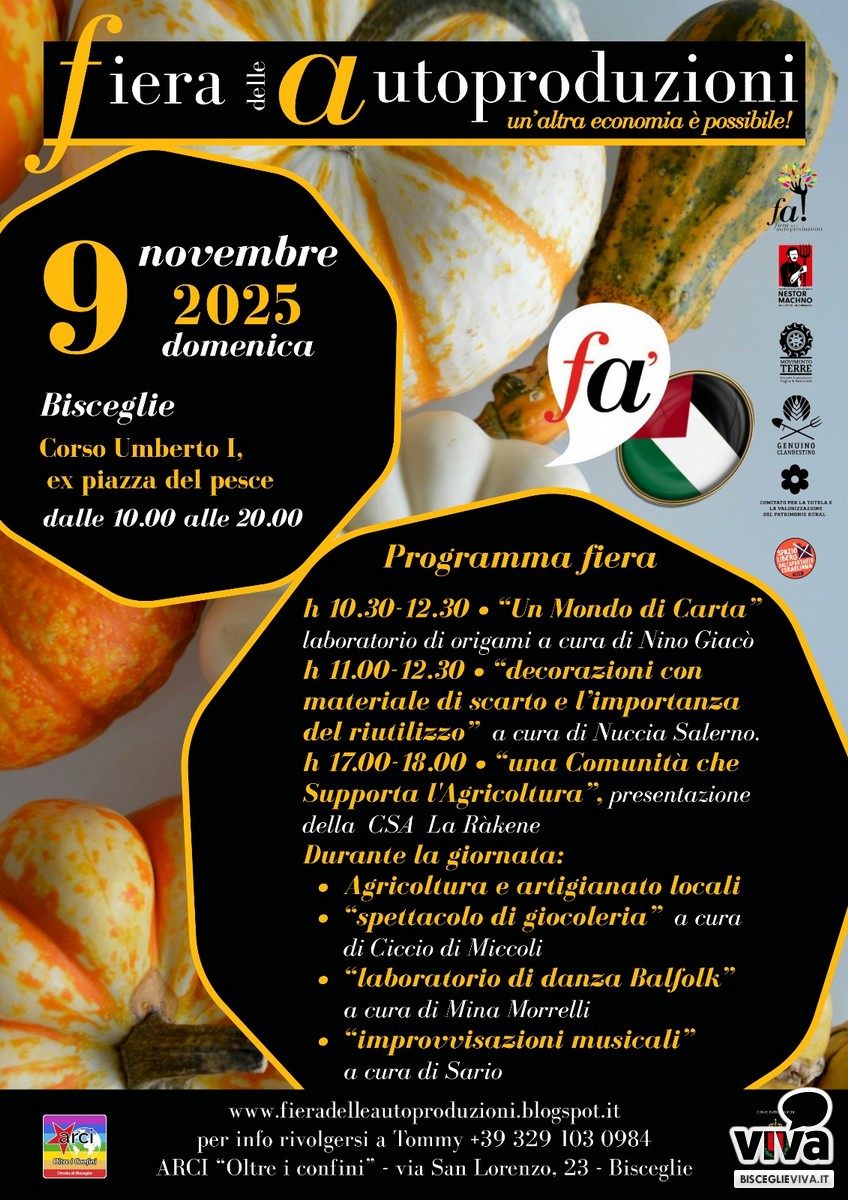 Domenica 9 novembre, dalle ore 10 alle 20, appuntamento con la Fiera delle Autoproduzioni presso l'ex piazza del pesce, in Corso Umberto I. L'iniziativa è organizzata dal Circolo Arci "Oltre i Confini" in collaborazione con il Comune di Bisceglie, la Fiera delle Autoproduzioni di Molfetta e l'Associazione Terra e vedrà la partecipazione di espositori locali e non, a testimonianza della forte cooperazione presente nel territorio pugliese.