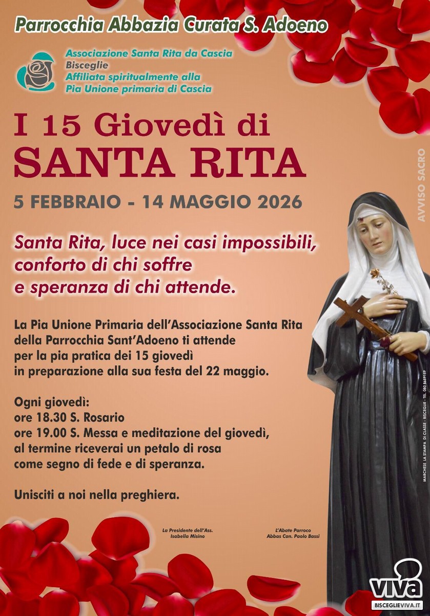 Si rinnova anche per il 2026 tradizione dei "15 giovedì di Santa Rita", un momento di preghiera dedicato alla Santa organizzato dall'associazione Santa Rita da Cascia di Bisceglie nella parrocchia di Sant'Adoeno. Ogni giovedì sino al 14 maggio si reciterà il Rosario alle 18:30, seguito dalla celebrazione eucaristica alle 19:00, tutto in preparazione per la festa liturgica del 22 maggio.