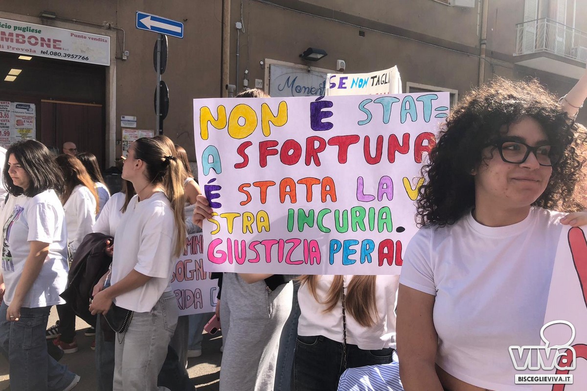 Il corteo pacifico è stato promosso dai rappresentanti d'istituto del Dell'Olio-Cosmai e del liceo Leonardo da Vinci: la partenza questa mattina alle 8:30 dalla Riccardo Monterisi (scuola che la ragazzina frequentava ormai da due anni), con arrivo al Palazzuolo in piazza Vittorio Emanuele II. I cartelloni e gli striscioni preparati dagli studenti hanno espresso e riassunto pensieri e stati d'animo dopo quanto accaduto.