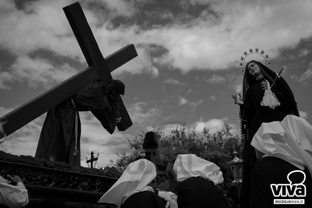 Alle 10.01 di venerdì 18 aprile si è rinnovato, a Bisceglie, il rito dell'Incontro tra la Madonna Addolorata e Gesù che porta la Croce. Le due statue, condotte a spalla dalle arciconfraternite di San Giuseppe e della Madonna Addolorata, accompagnata dall'associazione femminile dell'addolorata e dalla confraternita dei Santi Martiri sul palco allestito all'incrocio tra via Bovio e via Imbriani, si sono avvicinate nel silenzio delle migliaia di persone assiepate dietro le transenne.Uno dei riti più sentiti dalla Comunità biscegliese, che come ogni anno ha assistito numerosa al rito, pregando insieme all'Arcivescovo Sua Eccellenza, Mons. Leonardo D'Ascenzo.