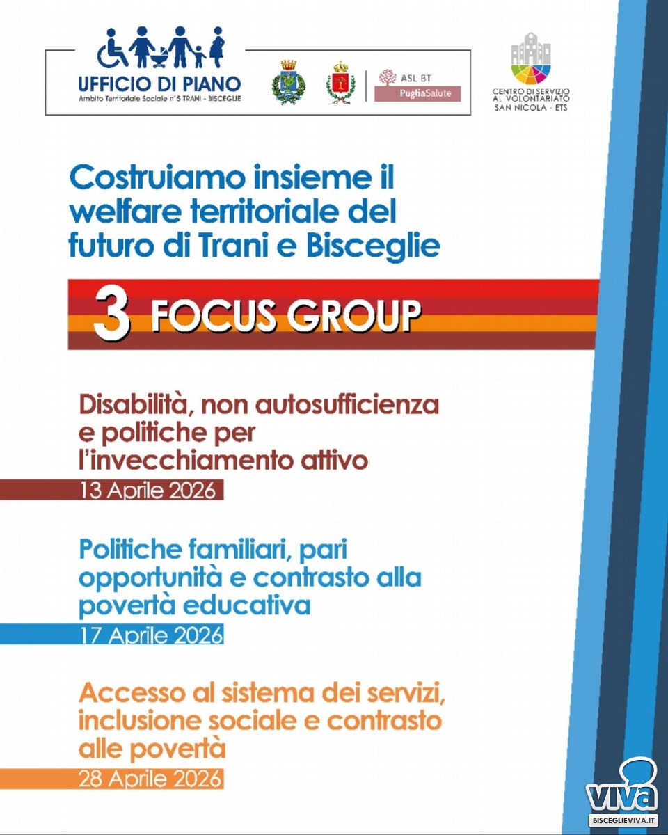 Un percorso di focus group per ascoltare il territorio e costruire insieme il welfare del futuro di Trani e Bisceglie: è l'iniziativa lanciata dall'Ambito territoriale delle due città interessate, in collaborazione con il centro di servizio al volontariato San Nicola. Attraverso l'organizzazione di tre focus group dedicati ai diversi temi del sociale, saranno raccolti bisogni, criticità e aree di miglioramento, per costruire insieme un welfare più vicino alle persone.
